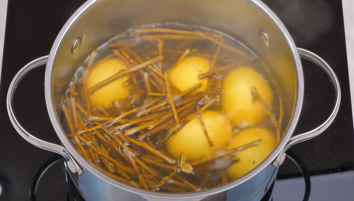 За цим методом отримаємо жовто-лимонний колір. Обов’язково використовувати молоді гілочки. Нарізаємо у каструлю, заливаємо водою, доводимо до кипіння і варимо 10-15 хвилин. Додаємо сіль і акуратно опускаємо яйця.