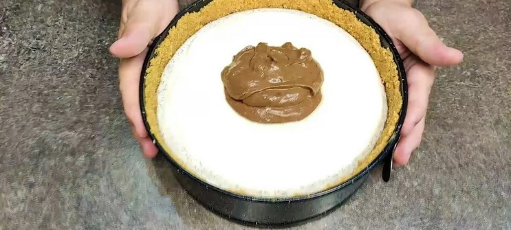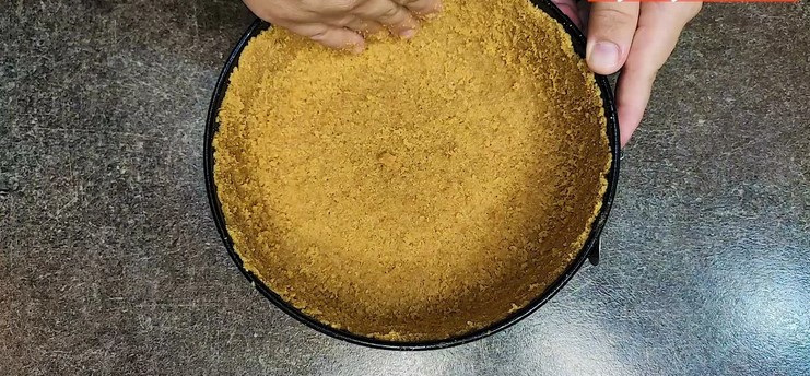 Форму діаметром 20 см, дно застеляємо пергаментним папером, висипаємо підготовлену крихту, формуємо бортики і рівномірно розподіляємо по дну.