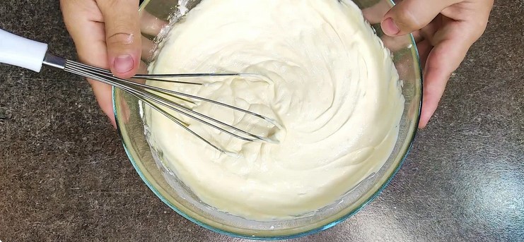 У глибоку миску викладаємо сметану, додаємо жовтки і висипаємо кукурудзяний крохмаль, перемішати віночком до однорідної маси.