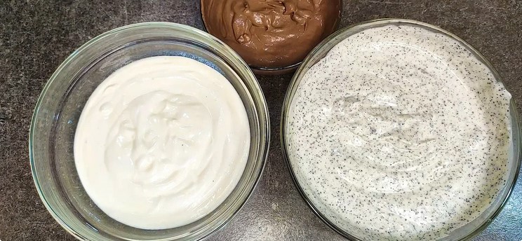 У миску де знаходиться 450 грам всипаємо подрібнений мак, перемішати, в 300 грам нічого не додаємо, в 150 грам всипаємо какао і добре перемішати.