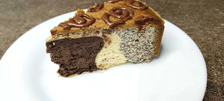 Дістаємо форму з морозилки, першим шаром виливаємо макову масу, другим шаром зметану і третім шаром какао.