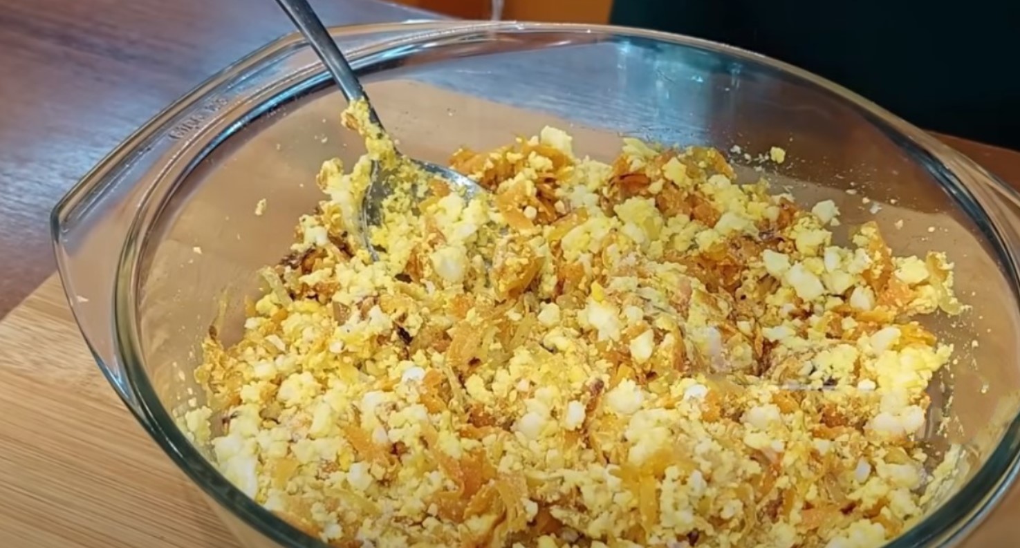 Для начинки тушимо цибулю з морквою і змішуємо з тертим яйцем, солимо і перчимо, додаємо зелень.