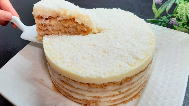 У форму (роз’ємне кільце d18 см) чергуємо: крихта → крем → крихта → крем. Верхній шар — крем + кокос. -