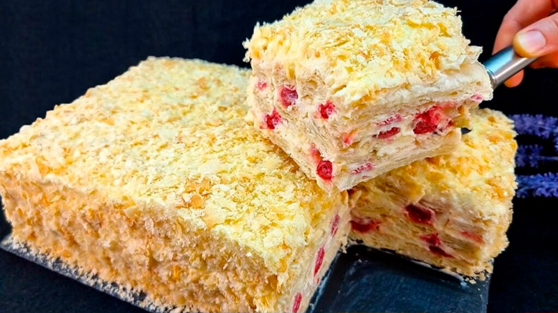 Цей варіант торта «Наполеон» підкорює з першого шматочка! Його не потрібно довго пекти, а смак — як у класичного десерту з дитинства, але ще й із приємною вишневою кислинкою.